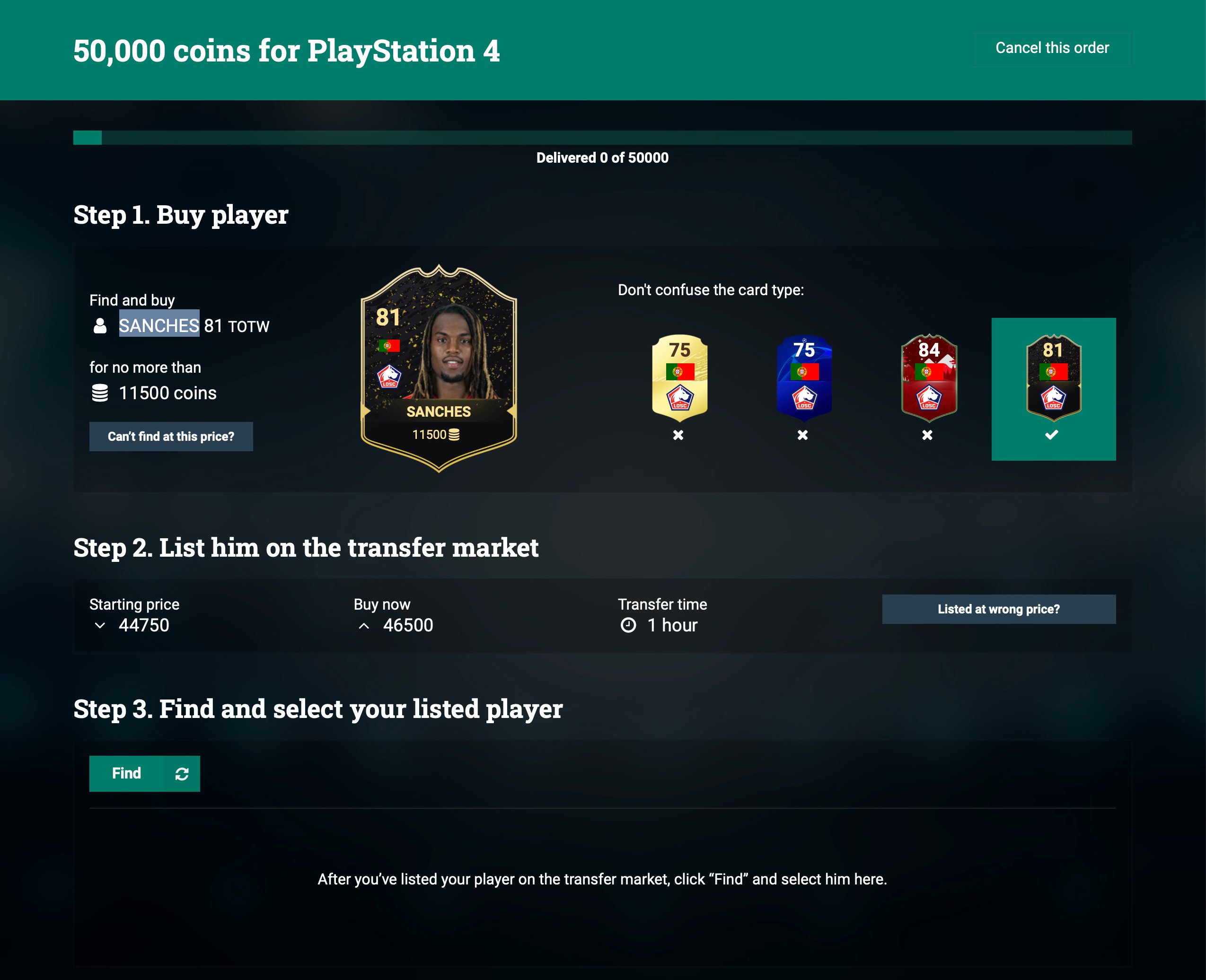 Normalt foregår overførslen af mønter i flere faser. Det vil sige, at så snart din spiller er købt af vores leverandør, vil webstedet vise den næste spiller til køb og salg.