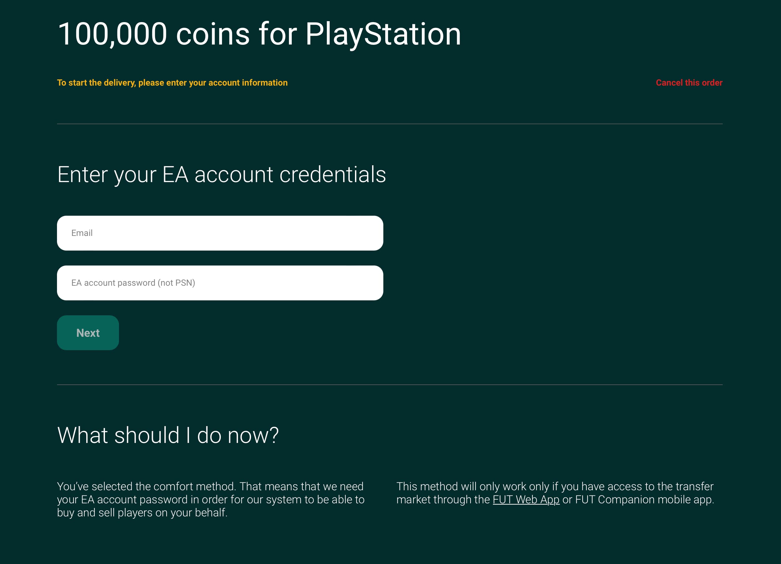 Após o processamento do pagamento, insira as credenciais da sua conta EA (e-mail, senha + código bakcup único que você encontrará em myaccount.ea.com). Depois que nosso bot fizer o login com sucesso na sua conta, você só terá que esperar até que o processo de entrega seja feito.